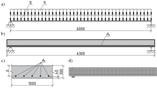 RC slab details []: (a) static scheme; (b) side view; (c) cross section; (d) finite element model (dimensions are in mm). g is the dead load; q is the live pedestrians load; As is the area of reinforcement.