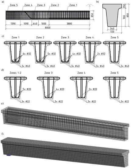 Reinforced concrete bridge girders used in the analysis []: (a) longitudinal cross section and division into reinforcement zones; (b) cross section; (c) reinforcement details of the roadway bridge girder in different zones; (d) reinforcement details of the footbridge girder in different zones; (e) computer model; (f) finite element model (dimensions are in mm).