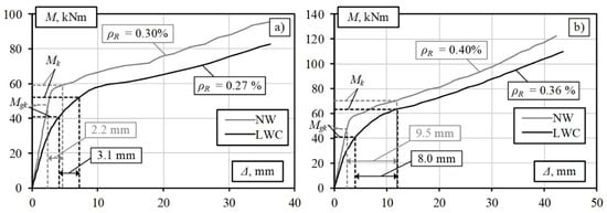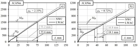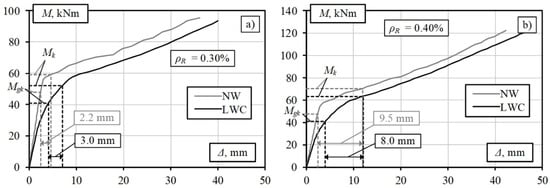 The modelling results for the roadway bridge girders are presented in Figure 8a, and those for the pedestrian bridge are presented in Figure 8b. Figure 8a shows that at a high reinforcement percentage (ρR = 2.33%), the numerical deformation analyses of elements having the same parameters using the LWAC and NWC physical models yield approximately the same calculation results. The slight differences in the curves for the LWAC and NWC girders are related to the different moduli of elasticity of these materials. The LWAC and NWC results are also in good agreement because the effect of tensile concrete between the cracks on the stiffness in highly reinforced elements is insignificant. Owing to this factor and the low ratio of permanent to total load (0.28–0.30, Table 2), the reduction in concrete density does not have a significant structural effect.