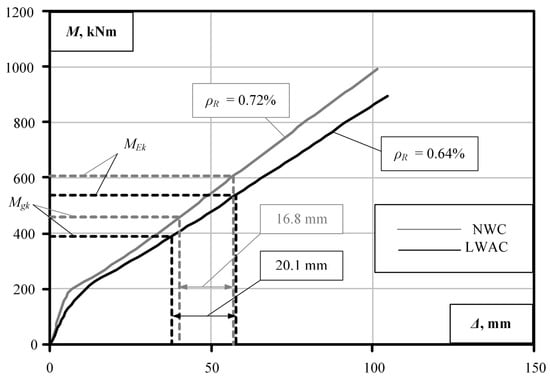 The simulation results for the standard and lightweight concrete slabs with the same parameters are shown in Figure 6. The results were compared at the total characteristic bending moment, MEk. In bridge design practice, deflections caused by permanent loads, including long-term changes, are usually compensated by the initial deflection of the structures. The stiffness of structures is usually limited by deflections caused by characteristic variable traffic loads, which in turn are limited by the relative deflection limits regulated by the design standards. The limitation of deflections in lightweight RC owing to its lower stiffness can be a decisive factor in the design of these structures.
