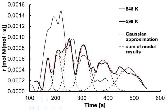 Based on the dependence of nitrogen concentration in the sample on the time of the nanocrystalline iron nitriding, the rates of this process were calculated as shown by time for temperatures of 648 and 598 K in Figure 2. For the dependence of the nanocrystalline iron nitriding rate on the time of the process, the occurrence of oscillatory reaction rate changes was observed. These oscillations were observed throughout the temperature range under investigation.