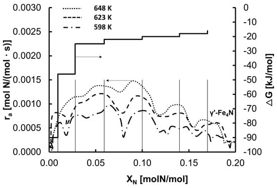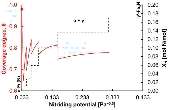 In the state of chemical equilibrium, when the chemical potential of nitrogen is equal to the absolute value of the potential change in the deformed crystal lattice of nanocrystalline iron, the saturated solution of α-Fe(N)—which is in a state of chemical equilibrium—is transformed to an unsaturated solution of nitrogen in the γ-iron crystallographic phase—which, in turn, is in a state of transition—and further to γ’-Fe4N nitride, which is again in the chemical equilibrium state [,]. The step change in the nanocrystalline iron nitriding rate (Figure 2 and Figure 3) can be explained by the gradual change in the degree of coverage of the iron surface with nitrogen (Figure 4), caused by the gradual change in the free enthalpy of nitrogen segregation (Figure 3). At each step change, a metastable state of FeNx is formed. Therefore, the continuous function (Equation (6)) was modified to a stepwise variable function. Transformation of a single α-Fe(N) nanocrystallite into γ’-Fe4N occurs via the formation of six metastable FeNx states. In the first stage of the nitriding process, a solution of nitrogen in nanocrystalline iron—α-Fe(N)—is obtained, for which the free enthalpy of segregation equals –90 kJ/moL []. From the stable phase of α-Fe(N), after exceeding a critical concentration of ca. XN = 0.004 mol N/mol, a metastable phase is formed, where maximum coverage of the surface with nitrogen is reached at a critical XN value for the metastable phase after surface coverage is increased by an increase in the concentration of nitrogen in the nanocrystallite volume. Figure 4 shows the dependence of the coverage of the iron surface with nitrogen and the concentration of nitrogen in volume on the nitriding potential. The value of the minimum nitriding potential at which the phase transformation in the nitriding reaction starts from nanocrystalline iron to iron nitrides is taken from Figure 1. With the minimum nitriding potential P0 = 0.034 Pa−0.5, the degree of surface coverage of a single iron nanocrystallite—α-Fe(N)—with nitrogen is θ ≈ 0.999 (for ΔG = −90 kJ/mol). Changes in the surface coverage during the single iron nanocrystallite nitriding process for subsequent metastable phase transformations at 598 K were calculated based on Equations (4) and (6). Based on Equation (7), values of the free enthalpy of segregation were calculated, and the results are shown in Figure 3 in relation to the nitrogen concentration in iron.