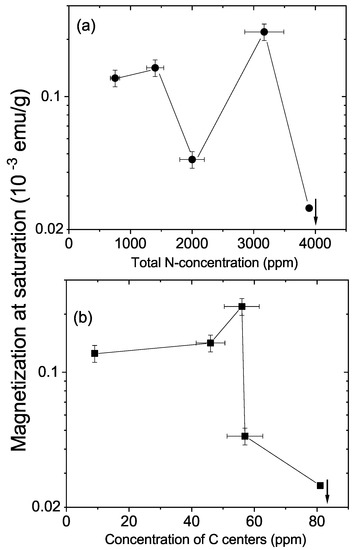 - Setzer, A.; Esquinazi, P.D.; Daikos, O.; Scherzer, T.; Pöppl, A.; Staacke, R.; Lühmann, T.; Pezzagna, S.; Knolle, W.; Buga, S.; et al. Weak Electron Irradiation Suppresses the Anomalous Magnetization of N-Doped Diamond Crystals. Phys. Status Solidi 2021, 258, 2100395. [Google Scholar] [CrossRef]