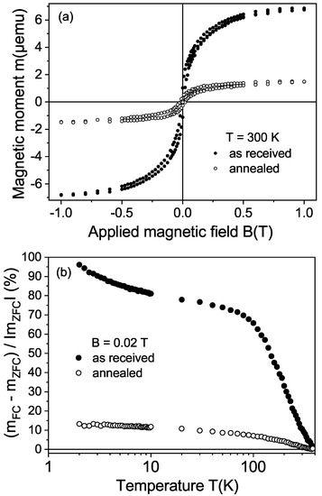 - Friedman, A.L.; Chun, H.; Jung, Y.J.; Heiman, D.; Glaser, E.R.; Menon, L. Possible room-temperature ferromagnetism in hydrogenated carbon nanotubes. Phys. Rev. B 2010, 81, 115461. [Google Scholar] [CrossRef]