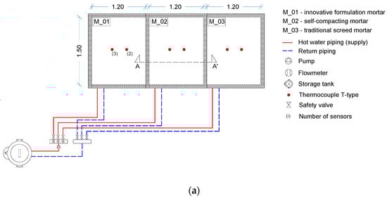 An experimental setup was built that included three rectangular slabs with a hydronic RFS of the same size, shape, and pitch. The dimensions of the slabs were 1.20 × 1.50 m, with a thickness of 0.095 m. Hot water piping was applied upon an insulation board and embedded within a screed mortar. Each slab was executed with a different screed mortar formulation (as mentioned in Section 2) and their performance was monitored under heating cycle and free-floating conditions (system turned off).