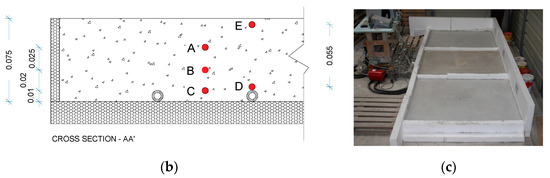 Solid hexahedra finite elements (FEs) of 8 nodes were used to simulate the slab. The adopted mesh comprised 31,200 elements and 35,139 nodes (Figure 6a). To simulate the test conditions, the ambient air temperature was defined according to the measurements carried out in situ and the water temperature was imposed as presented in Figure 6b. Figure 7 is a schematic representation of the cross-section of the slabs used in the modelling, and Table 2 presents the material properties introduced in the model.