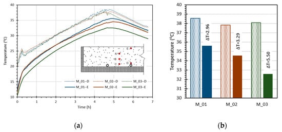 Figure 4a depicts to the temperature profile evolution of two monitoring points of the screed mortar (D, over the pipe in which water circulates at 45 °C; E, near the slab surface). The temperature profiles highlight that a more rapid temperature rise was recorded for all screed mortar solutions within the first 20 min of heating, indicating a significant energy transfer to the screed mortars that then continued to increase at a slower rate.