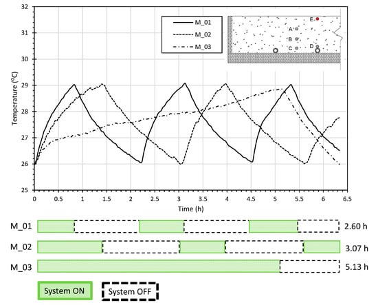 The three RFS comprising the different screed mortars under study (M_01, M_02, and M_03) were tested for a temperature setpoint between 26 °C and 29 °C, as shown in Figure 5.