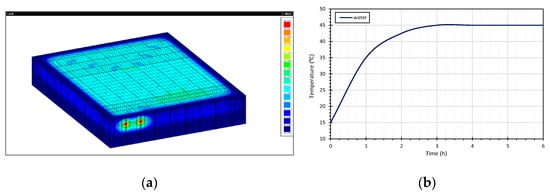 In the numerical analysis, the M_01 slab, executed with the traditional mortar screed, was simulated to evaluate the impact of applying different materials on the slab surface as a finishing layer, by analysing the surface temperatures’ distribution. The numerical simulation of the hydronic RFS was performed using FEMIX computer software [53]. A general thermal model to simulate the heat transfer in structures built with materials whose mechanical behaviour can be considered linear or nonlinear is available in FEMIX, including heat development due to the hydration process of cement-based materials [54]. Thus, this general thermal model is specified for steady-state and transient thermal analysis as well as for nonlinear thermal analysis. This thermal model can be coupled with a mechanical model to simulate specific thermophysical and mechanical aspects such as crack initiation and propagation in structures discretized with solid finite elements [55]. Since the mechanical analysis was beyond of the scope of this research, only the thermal behaviour of the slab system was analysed and compared to the obtained experimental data.
