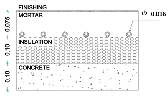 The ambitious energy efficiency standards driven by European Union (EU) Energy Efficient Directive have impacted the national regulations leading to the challenge of nearly zero energy buildings (nZEB) [1,2,3,4,5]. As indoor heating and cooling are the major sources of buildings’ energy consumption [6], when it comes to indoor heating and cooling, radiant floor systems (RFSs) comprise specific characteristics that play a key role in attaining the EU energy efficiency goals. Considering indoor environment quality, radiant heat transfer improves thermal comfort by preventing cold draughts while mitigating the air-borne noise related to system operation. Additionally, the use of radiant systems result in the reduced transportation of pollutants and allergens compared to convective systems, contributing to healthier indoor environments. In combination with the ability to ensure high thermal comfort, reduced energy consumption, and quiet operation, RFSs became increasingly popular, currently being installed in 30–50% of EU new buildings [7,8]. Additionally, RFSs ensure uniform temperature distribution [9] with low distribution losses [10], and therefore highly efficient heating systems, able to deliver improved thermal comfort with minimal vertical temperature gradient compared to air systems solutions [11].