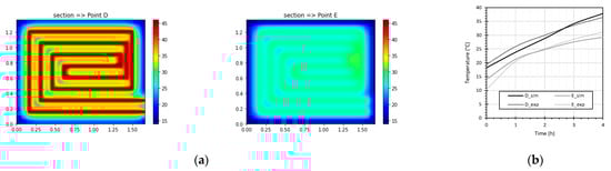 As observed in Figure 3, a uniform surface temperature distribution was achieved after 240 min regarding the three test slabs. The temperature distribution within the screed mortar was monitored in five positions (A to E). The temperature values over the pipe (D) and close to the surface (E) are presented in Figure 2b. The temperature variation throughout the test is presented in Figure 4a, and the differences in the maximum temperature attained in each slab are highlighted in Figure 4b.