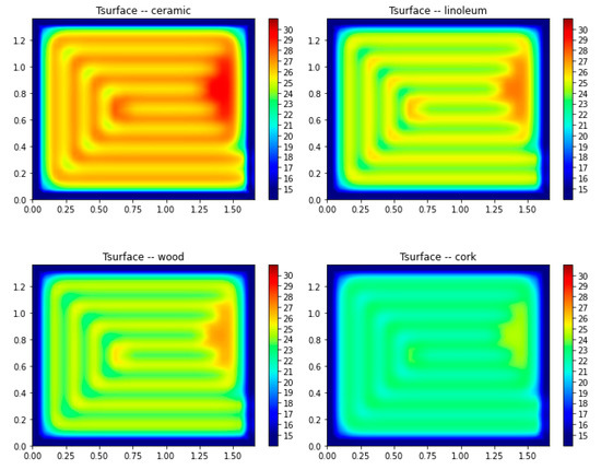 After validation, the model was used for a sensitivity analysis to assess the impact of using different finishing materials in the distribution of surface temperatures. As such, four typical materials applied in RFS were selected: ceramic, linoleum, wood, and cork. The properties of the materials used in the simulation are detailed in Table 3 as well as the obtained temperatures regarding the maximum (Tmax) and the average temperature of the surface (Tsurf). Figure 9 shows the temperature distribution on the surface of the slab for the different finishing materials.