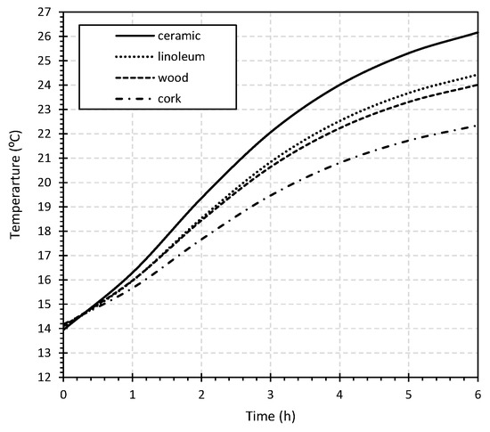 As observed in Figure 10, the use of ceramic as the finishing material of an RFS provides the advantage of higher thermal conductivity, resulting in higher temperatures and reduced operation time. Ceramic finishing reached the same temperature value approximately two hours before the cork finishing. Additionally, after 6 h of operation, the temperature difference between these two finishing materials was 4 °C. Due to the lower thermal conductivity, cork resulted in the finishing material requiring a longer operating period of the system with a lower surface temperature achieved. Linoleum and wood produced similar results in terms of surface temperatures profile.