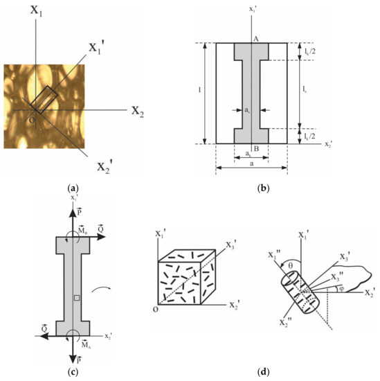 Highly porous cellular plastic: (a) Micrography showing the reticulated morphology of foams and global (i.e., foam) and local (strut) coordinate systems; (b) Schematic of the structural element comprising the load-carrying element (gray); (c) Schematic of the load-carrying element showing the loads applied to it; (d) Calculation element for estimation of stiffness tensor of the nanoplatelet-filled material of load-carrying element.
