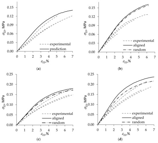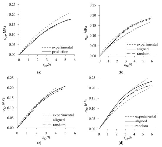 It is seen in Figure 3b–d that the calculated curves for filled foams tend to pass above the experimental diagrams. Such an overestimation of foam stiffness by the model is likely to be caused by a partial exfoliation of the clay contained in foam struts, as opposed to complete exfoliation assumed in calculations. It has been shown in, e.g., [37] that, for a given loading of clay filler, reduction in the fraction of exfoliated particles leads to a substantial decrease of the stiffness of the filled composite. In addition, the nonlinearity of deformation appears overestimated at the higher loadings of the filler, Figure 3c,d and Figure 4d. This can be explained by the fact that, when describing nonlinear deformation of foams, the effect of was taken into account only approximately due to the simplifying assumption used that . To fully reflect in the model the effect of filler on the nonlinearity of foam deformation, it is necessary to determine the coefficients and in relations (22) for some non-zero value of , thus calibrating the model.