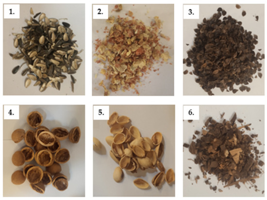 The experiment studied followed six biomass materials as potential eco-friendly substitutes for conventional fuels: pistachio husks (Pistacia vera), walnuts husks (Juglandaceae), sunflower husks (Helianthus), coconut shells (Cocos nucifera), corncobs (Zea mays), buckwheat husks (Fagopyrum esculentum). These materials are waste biomass (Figure 1) from industrial processes, which elevates their attractiveness as a prospective fuel due to abundance in areas of production, low price and easy access.