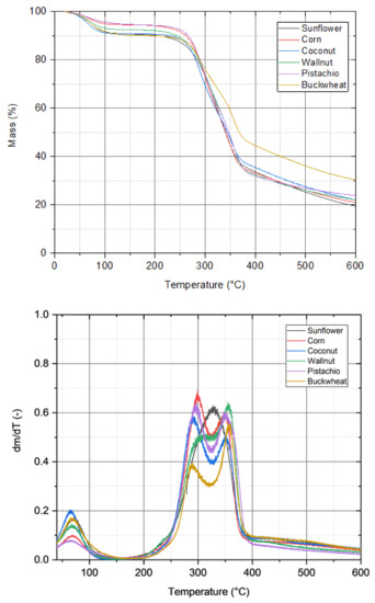 Thermogravimetric analysis showed an overall similarity of the pyrolysis process for all specimens. Figure 3 shows a slight decrease of around 5–10% in the range from 0 to 100 °C, and an insignificant change of mass between 90 and 260 °C. The peaks below 100 °C for all samples are integrated with water evaporation. The most intensive degradation can be observed between 260 and 380 °C. The difference between the samples is the greatest in this range. Buckwheat husk lost approximately 45% of the mass, while the other samples lost almost 60%. A 20% loss of the mass was achieved in the following temperature interval between 380 and 790 or 850 °C. The analysis showed that buckwheat husks were the least susceptible to high temperatures and lost the least mass percentage, 73%, while sunflower husks lost the largest amount, almost 90%. The similar shape and intensity of peaks from degradation curves in TG analysis represent the same composition of raw materials. The left-hand peak is related to hemicellulose degradation, which is in the range of 250–350 °C [51]. The second peak in range of 320–400 °C is related to cellulose and lignin degradation, which causes the peak to extend. The intensity of peaks in buckwheat is smaller than in other biomass material, which could be caused by a smaller number of mentioned compounds. The sunflower degradation curve is different, which is associated with other components of raw material and could be caused by a high intensity of hemicellulose peak or cellulose without other components. The analysis of the degradation curves of raw materials confirm that the pyrolysis begins at about 250 °C and finished up to 400 °C, where the mass of samples is reduced to 30% of initial mass (the rest is the volatile matter). In this work, pyrolysis was conducted at 800 °C to completely remove volatile organic compounds to potential future use of char material as a calorific fuel-biochar means that the combustion process does not generate harmful exhaust gases, such as dioxins.