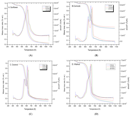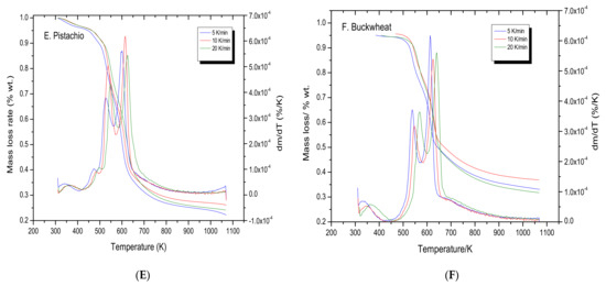 Biomass samples in TG analysis during various heating rates: 5, 10, 20 K/min. (A) Sunflower hulls, (B) Corncob, (C) Coconut shells, (D) Walnut husks, (E) Pistachio husks, (F) Buckwheat husks.