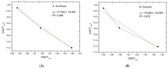 The Kissinger method for all biochar samples was used to calculate the energy activation of pyrolysis process in various heating rate. The energy activation was calculated from the plot of ln (β/T2max) against 1000/Tmax for the series of experiments at different heating rates (β) for all biomass samples. The Tmax is temperature which corresponds to the maximum of weight loss peaks—from the DTG curve for each heating rate (Figure 4). The data obtained during the degradation process were used in Equation (5) and are presented on Figure 5; the regression equations and the square of the correlation coefficient (R2) are presented on the plots.