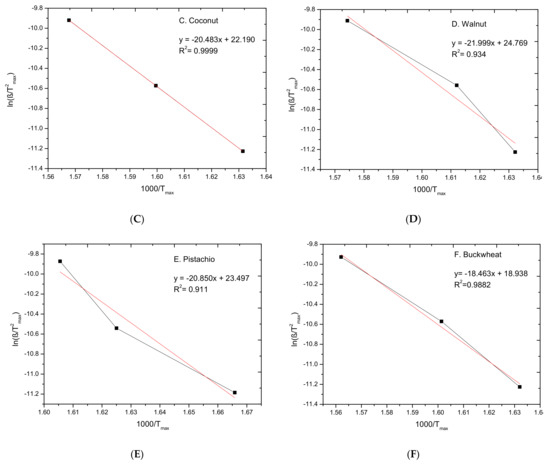 Kissinger plot of (A) Sunflower hulls, (B) Corncob, (C) Coconut shells, (D) Walnut husks, (E) Pistachio husks, (F) Buckwheat husks.