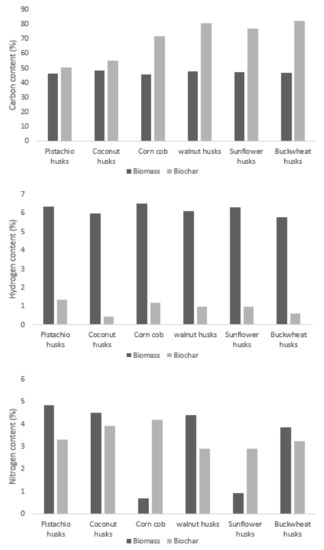 The samples were subjected to elemental analysis. The carbon, hydrogen and nitrogen content in the samples subjected to pyrolysis and post-pyrolysis charcoal were determined (Figure 6). The carbon content for all types of biomass increased as a result of pyrolysis. The increase in carbon content varied from low for pistachios (4.2% wt.) and coconut (7% wt.) to the largest for buckwheat (35% wt.). The rise in carbon content increases the calorific value of the charcoal.