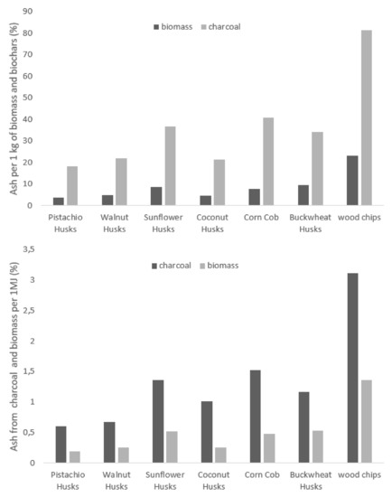 The main characteristic value for raw material samples is ash content, which is a representative value for comparing biomass-derived biochars. Ash contents per unit mass of biochar and unit heat of combustion were calculated for all the analyzed fuels.