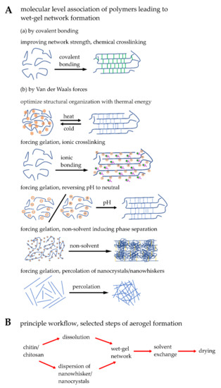 Schematic drawing presenting selected steps of a workflow of chitin/chitosan-aerogel production. (A) Network formation methods at the molecular level either by covalent bonding or by Van der Waals forces, mainly hydrogen bonding. (B) A general principle workflow of aerogel synthesis includes several steps: network-formation, solvent exchange, and drying. For more details, see [54,114,133].