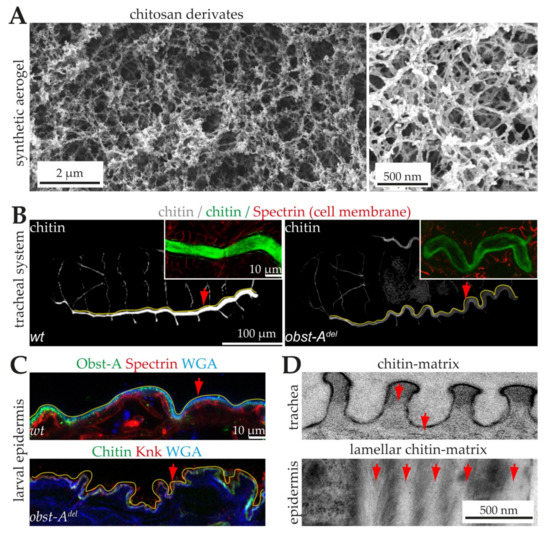 Synthetic and genetically controlled chitin matrices. (A) Scanning electron microscopy images of aerogel chitosan derivates [133]. Scale bars indicate 2 µm (left) and 0.5 µm (right). (B) 3D-projections of confocal Z-stacks of whole-mount immunostainings showing chitin (green) in late Drosophila embryos. Anterior is left, dorsal is up. An Alexa488-linked chitin-binding probe (green) detects chitin in the tracheal tube lumen. The main tracheal tube (marked by yellow lines) is straight and stable (arrow, left image) in wt but over-elongated and unstable with sinusoidal buckling (arrow, right image) in obstructor (obst)-A null mutants. Inlay, wt embryo shows a bright chitin staining (green) in the tracheal tubes, while the obst-A null mutant embryo contains only weak chitin staining (green), indicating unusual premature degradation of the matrix. The α-Spectrin antibody marks the tracheal cell membranes (red). Scale bars indicate 10 µm (inlay) or 100 µm. (C) Confocal images of ultrathin epidermal sections of larval immunostainings. The wt epidermis (upper image) contains a tight cuticle (indicated by the yellow line) that shapes the straight appearance of the epidermis (arrow) of the animal. In obst-A mutants (lower image), the epidermal chitin matrix (yellow line) lost its stability and integrity, resulting in a fragile, wrinkled epidermis (arrow) with partial lesions between cells and cuticle. The Obst-A and Knickkopf antibodies detect the chitin matrix. The Alexa633 conjugated wheat germ agglutinin (WGA, in blue) is a lectin that marks chitin and membranes. Scale bar indicates 10 µm. (D) Transmission electron microscopy images reveal the soft non-lamellar (upper image, arrows), tracheal and tight lamellar (lower image, arrows point to chitin-lamellae) epidermal chitin matrices. Images were provided by Dr. Dietmar Riedel (Electron Microscopy Group, Max-Planck-Institute for Biophysical Chemistry). Note the fine twisted plywood-like structure of lamellar chitin-protein planes in the epidermis. Red lines indicate epidermal cell surfaces. Scale bar indicates 0.5 µm.