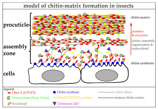 Insects possess a large number of cuticle proteins that contain chitin-binding domains and belong to different families [189,190,191,192,193]. Proteins with one or three chitin-binding domains (CBD) are members of the CPAP1 or CPAP3 family (Cuticle Proteins Analogous to Peritrophis) [194,195,196,197,198]. Those with a Rebers and Riddiford (R&R) chitin-binding sequence belong to the CPR family [192,193,195,196]. However, only a small number of the numerous chitin-binding proteins are critical for matrix formation (summarized in [111]). They mainly determine physiochemical properties such as the viscoelasticity and permeability of matrices. For example, loss of Tribolium CPR18 and CPR27 results in wrinkled elytra [199], and CPAP-1C, -H, -J knockdown showed fragile chitin matrix and structural integrity effects [194]. The CPAP-analogous Drosophila genes were identified as the obstructor (obst) gene family, consisting of 10 members, each with three chitin-binding domains [200]. Null mutant studies of three members, Obstructor (Obst)-A, Obst-C, and Obst-E, confirmed their vital and critical functions in assembling chitin matrices during insect development [198,201,202]. The mutant studies further prove that the chitin matrix assembly and packaging into higher-ordered structures are prerequisites for cuticle stability, tightness, protecting function, and insect survival [183,202].