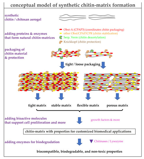 A conceptual model for the usage of critical proteins that control properties of synthetic chitin matrices. The known functions of the proteins are indicated. The combination of synthetic chitin-based aerogels with proteins controlling the chitin packaging and additional bioactive molecules (discussed in the text) will significantly improve and adjust the properties of the materials for customized biomedical applications. The eco-friendly biodegradability is an additional advantage of these new materials.