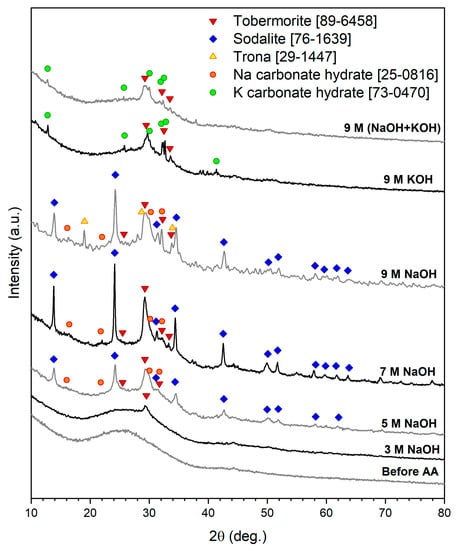 X-ray diffraction patterns of FGW before and after alkali activation.