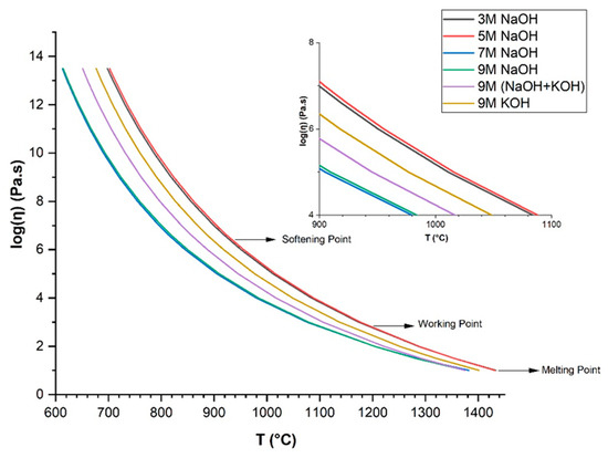 The viscosity–temperature relation in glasses was calculated by the Vogel–Fulcher–Tammann (VFT) equation: log(η) = A + B/(T − T0) [21], where A is the logarithm of the viscosity at the high temperature, and B is the free fitting parameter of the VFT equation. Based on the chemical composition of glasses (activated by different concentrations of alkaline solutions, Table 1), the viscosity–temperature relation of the batch can be estimated, as shown in Figure 4. The increase in Na2O content in the glasses activated by 3–7 M NaOH solutions decreased the viscosity in the glass melting range, while activation with 9 M NaOH led to a glass with slightly lower Na2O content and moderately higher viscosity.