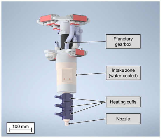 For example, for processing fiber-filled materials, a cylindrical nozzle geometry would be selected to prevent individual fibers from sticking out in build direction and therefore causing failed parts. On the other hand, if an unfilled material is being processed and the thermal stress on the component should be limited, a conical shape would be advantageous. In combination, the above-mentioned aspects allow for a high material throughput. It is capable of processing thermoplastic pellets, which are less expensive as compared to filament used in other machines. It therefore enables additive manufacturing using standard plastics used in other processes. Furthermore, high levels of filling materials, such as carbon fibers or glass fibers, are possible. Figure 1 shows the extruder and its components.
