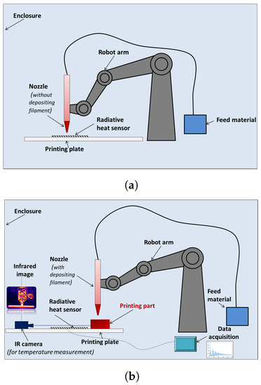 Experimental setup for determining the amount of thermal radiation during extrusion-based AM processes: (a) radiative calibration of the extruder with nozzle over the IR sensor without polymer extrusion, (b) infrared measurement from part and extruder during polymer extrusion.