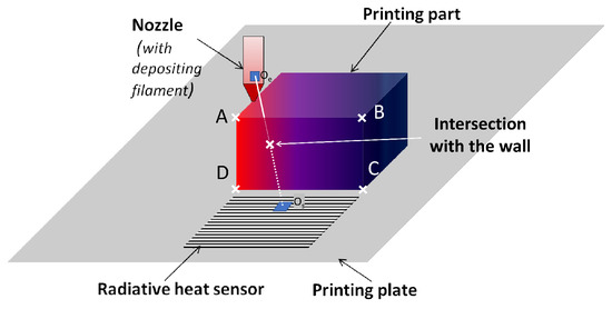 In order to compare experimental data to numerical results, the computation of the power ( Equation (5)) received by the sensor from the nozzle is done for discretized locations on the nozzle path with a virtual displacement speed. The nozzle’s value of emissivity and the part’s value of emissivity are taken equal to [18].