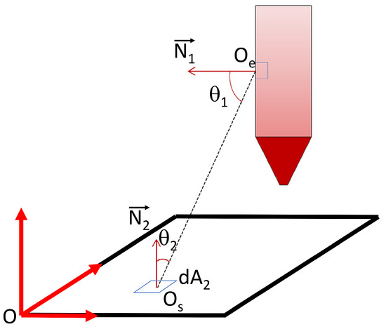 The point of intersection between the segment and the plane is compared with the two triangles. If the point is inside one of the two triangles, the view factor value between the extruder and the sensor is equal to zero. The intersection between respectively and the segment occurs when the value of is (Equation (4)).