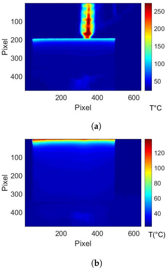Thermographic images where recorded as a video sequence with the infrared camera [22]. The temperature field recording of the manufactured part’s front face is done with an OPTRIS IR camera (Figure 6). This camera has a fixed focus lens. A post-treatment of the data is needed to create a continuous crop of the images in order to focus only on the already manufactured part and remove the nozzle and the background. In Figure 6a, the process is at of the total manufacturing time. In Figure 6b, the thermography is taken at the end of the manufacturing process. These new data are synchronized with the nozzle position and the corresponding view factor computation between the nozzle and the IR sensor. In Figure 6a, the highest wall temperature is recorded at the same level of the extruder temperature [23]. This is the process temperature . The lowest temperature is recorded on the build plate [24]. In Figure 6, the reflection of the radiative emission from the manufactured part can be seen on the build plate. The wall temperature is homogeneous in each horizontal plane. It continuously increases from the build plate to the last deposited layer. The temperature values range from room temperature to the temperature of the extruded polymer. Additionally, the manufactured part is submitted to heat exchanges by convection on every side and by conduction with the build plate.