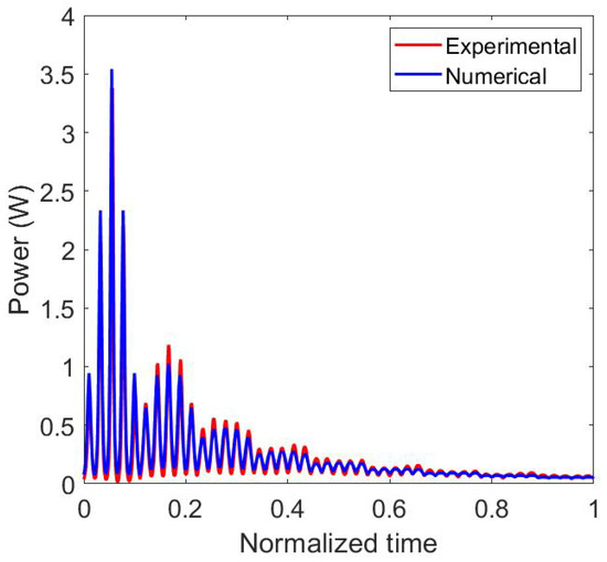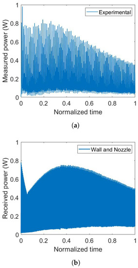 While manufacturing the box, a brim of ten perimeters is deposited in the first layer, ensuring good adhesion between part build surface during the process (Figure 5b). During this step, the nozzle is close to the build plate and gets closer to the sensor over time (up to in normalized time). In Figure 8a, as is not firstly expected, the power received by the sensor decrease while the minimum distance between the sensor and the extruder decrease. This effect is also visible in the numerical results (Figure 8b). This phenomenon is explained previously and it is related to the expression of the view factor (1) and the product of the cosines. In a second time, the value of the power measured by the sensor increase with the height of the manufactured box. The power value reaches its maximum around (normalized time) and then decreases till the end of the process. It can be seen that the measured power has a minimum value when the extruder is manufacturing the wall placed at the opposite of the sensor.
