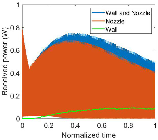 In order to explain the different phases of the power evolution, the part due to the nozzle and the part due to the wall of the box are uncoupled and plotted on the Figure 9. In the first phase, the power is only received from the nozzle. There is only the bottom of the box bonded to the substrate. In the second phase, both of the power received from the nozzle and from the wall are increasing. In the third phase, the power due to the wall still increase to an asymptotic value and the power due to the nozzle decreases. In this phase, when the nozzle is at the opposite of the sensor, the minimum of the power due to the nozzle reaches zero. The height of the box reaches a point where it hides the nozzle from the sensor. The two components of the power, nozzle and wall, have to be simulated to understand the experimental results. The power received from the wall has a monotonic variation contrary to the one received from the nozzle that has an alternative variation [25].