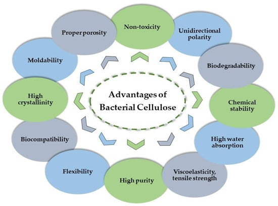 As expected, the properties of microbial cellulose reside in its structure. It consists of bundles of cellulose nano-fibrils (2–4 nm), which become ribbon-like structures of around 100 µm in diameter and 100 µm in length [,,,]. Due to this particular nanostructure, bacterial cellulose has the capacity to retain its dry weight inside water; this fact gives this biopolymer superior elasticity, flexibility, and resistance in humid conditions; therefore, bacterial nanocellulose represents an excellent natural resource for designing new bandages for the accelerated healing of lesions []. It exhibits an ultrafine web structure which is very difficult to disperse in water []. The crystallographic structure is similar to that of cellulose type Iα [,]. Compared to other biopolymers, bacterial cellulose exhibits a combination of unique properties due to its fibrillar structure and its light weight, its purity, and its macromolecular properties, including its polymerization degree of up to 8000 []; its other characteristics such as its hydrophilicity, crystallinity (up to 90%) [], moldability, non-toxicity, and biodegradability also set it apart []. The pure cellulose nanofibers confer intrinsic high purity and strength without the need of further refining treatments [,,,]. Chemical modifications are also permitted due to vacant hydroxyl groups that are not engaged in hydrogen bonds []. Its unique optical, electrical, and mechanical properties with numerous improvement possibilities have attracted the attention of scientists in many fields []. Bacterial cellulose morphology can be changed as needed. The literature data report these biogenesis interventions: growing cellulose in a chitosan-modified culture media or a methylcellulose-carboxymethylcellulose-poly(vinyl alcohol)-modified media for its application in wound dressings or other medical applications [,]. The main advantages of bacterial cellulose are summarized in Figure 2.