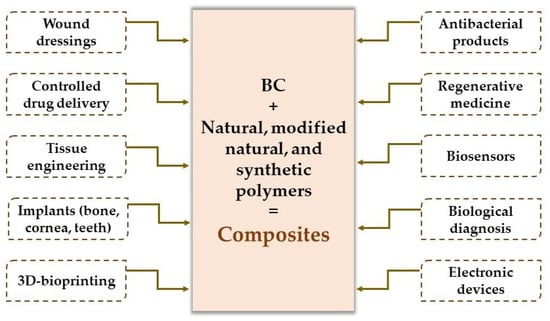 Due to the excellent physicochemical and biological properties of all types of biopolymers (natural, modified natural polymers, and synthetic), they can combine with bacterial cellulose to develop new composites with results that surmount their drawbacks and extend their applications []. BC-based composites have a large applicability in the wound healing process as wound dressings, as well as in tissue engineering, implants (bone, cartilage, cornea, teeth), 3D-bioprinting, the treatment of cardiovascular and neurological diseases, drug delivery, biosensors, electronics, and biofuels [,], as will be described below.