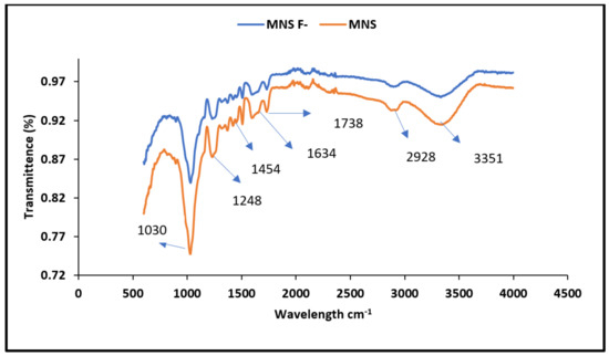 Figure 1 shows the FTIR spectra of MNS before and after fluoride bio-sorption. A wide transmittance band observed at wavelength regions 3351 cm−1 is linked to vibration and stretching of hydroxyl (OH−) groups of the moisture absorbed in the cellulose structure [20]. The vibration band at 2928 cm−1 wavelength region is linked to aliphatic group (C–H). The band at 1738 cm−1 is linked to a carboxylic group (C=O). The bands at 1454 cm−1 is assigned to the stretching and vibration of a C–C bond.