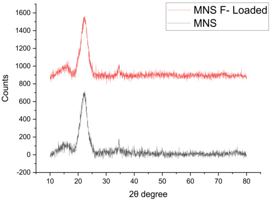 The X-ray diffraction spectra showing of MNS before and after fluoride removal is depicted in Figure 2. Major diffraction peaks are observed at 2θ degree = 17.31°, 22.17° and 34.35°, and they are ascribed to native crystalline cellulose (C6H12O6) structure. The X-ray diffraction spectra of MNS after fluoride removal showed similar peaks suggesting no change in the crystalline structure of the material after exposure to fluoride ions.