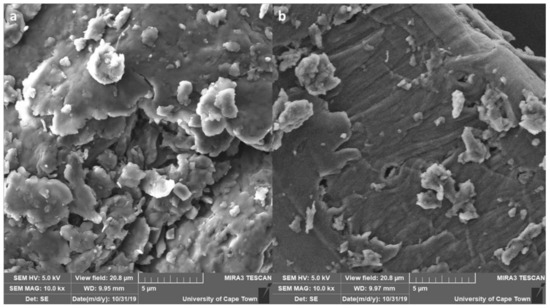Micrographs of macadamia nut shells before (a) and after (b) fluoride removal.