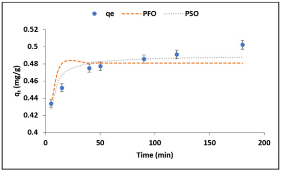 where qt (mg/g) is adsorption capacity at a given time t (min), qe (mg/g) is the maximum sorption capacity at equilibrium and k1 (min−1) and k2 (g/mg·min) are rate constant parameters for pseudo first and second order models, respectively. The nonlinear plots for PFO and PSO are included in Figure 5, while the respective constant values are shown in Table 3. Based on the correlation coefficient values (R2) in Table 3, the adsorption data for fluoride by MNS is described by pseudo second order suggesting chemisorption and ion exchange mechanisms.
