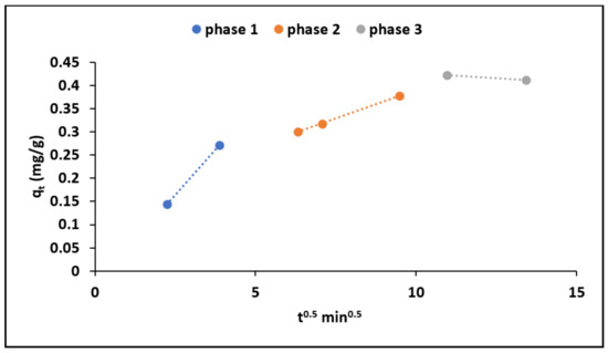 We observed that the plot yielded three clear phases confirming three different process that takes place during adsorption. The first phase is attributed to the adsorption in the external layer of the adsorbent, while the second and third phases are attributed to the diffusion of ions into the interior of the adsorbent and adsorption within the pores of the material, respectively [23,29].