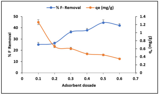 Effect of adsorbent dosage in %Fluoride removal and adsorption capacity.