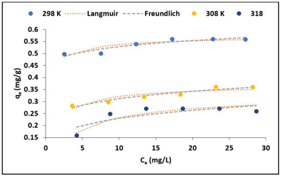 The commonly used nonlinear equations of Langmuir and Freundlich adsorption isotherms models were applied to explain the relationship between the adsorbate molecule ions and adsorbent’s surface. The Langmuir adsorption isotherm model is expressed by Equation (11). The model assumes monolayer adsorption wherein once the adsorbate molecule is adsorbed on a surface, no other ion may be adsorbed at that adsorption site [31]. The Freundlich adsorption isotherm model, which is expressed by Equation (12), is based on assumption that adsorption occurs on a heterogeneous surface and considers multilayer adsorption [31].