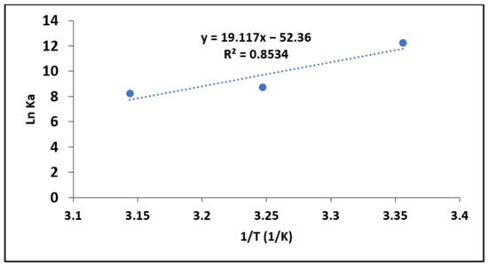where ∆Gº is the Gibbs free energy change (KJ/mol), R is the gas constant with the value of 8.314 J mol−1 K−1 and T is absolute temperature in Kelvin. Kc is the dimensionless equilibrium constant determined from the Langmuir constant (KL). The parameters of ∆Hº (KJ/mol) and ∆Sº (KJ/mol) represent the standard enthalpy change and entropy change, respectively, which are determined from slope and intercept of lnKc against 1/T.