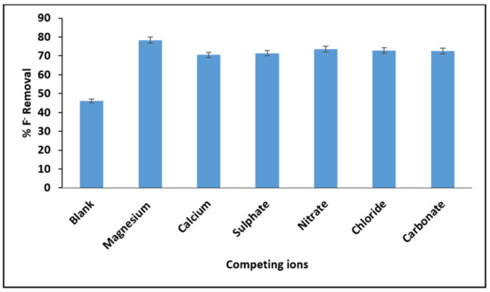 Figure 11 depicts the effect of co-existing ions in percentage fluoride removal. From the figure, the presence of magnesium (Mg2+), calcium (Ca2+), sulphate (SO42−), nitrates (NO3−), chlorine (Cl−) and carbonate (CO32−) enhances the percentage fluoride by MNS. Similar effects of co-existing ions were observed by Zhou et al. [37]. This could be an indication that the co-existing ions are creating more active charges on the surface of the adsorbent leading to enhanced percentage fluoride removal. These results indicate that MNS has a better advantage for application in groundwater defluoridation since its effectiveness is not limited by other co-existing ions.